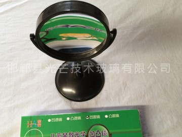 帶底座凹透鏡 直徑:10厘米 焦距:負(fù)300mm 幼兒園小朋友 或者中小學(xué)生認(rèn)識凹透鏡的特點(diǎn) 學(xué)習(xí)凹透鏡光學(xué)原理的的器材 尺寸大也時候教師教學(xué)演示用教具 知識拓展閱讀: 凸透鏡與凹透鏡可以從以下幾個方面加以區(qū)別:外形特征、對光線的作用、成像特點(diǎn)及用途等。具體方法如下: 方法一:用手摸,鏡子的中央部分比邊緣厚的是凸透鏡,鏡子的中央部分比邊緣薄的是凹透鏡。 方法二:隔著鏡子觀察距鏡子較近的書上的字,有放大作用的是凸透鏡;字變小的是凹透鏡。 方法三:隔著鏡子觀察距鏡子較近的書上的字,移動鏡子,若發(fā)現(xiàn)像的移動方向總是與鏡子的移動方向相同,則該鏡子是凹透鏡;若發(fā)現(xiàn)像的移動方向總是與鏡子的移動方向相反,則該鏡子是凸透鏡。 方法四:隔著鏡子觀察窗外的物體,若能看到上下左右都顛倒的像,這種鏡子是凸透鏡;若看到像是正立的,這種鏡子是凹透鏡。 方法五:將點(diǎn)燃的蠟燭放在離透鏡適當(dāng)距離處,在另一側(cè)光屏上能得到倒立實(shí)像的是凸透鏡;無論怎樣調(diào)節(jié),在另一側(cè)光屏上不能得到像的是凹透鏡。 方法六:讓鏡子正對太陽光照射,在鏡子的另一側(cè)放一張與透鏡平行的白色卡片紙,耐心調(diào)節(jié)鏡子與紙之間的距離,能得到一個小亮點(diǎn)的是凸透鏡;始終不能獲得小亮點(diǎn)的是凹透鏡。 方法七:觀察陽光通過了兩副眼鏡在地面上形成的光斑,若形成光斑的中間比四周明亮,則鏡子是凸透鏡;若形成光斑的中間比四周暗,則鏡子是凹透鏡。 方法八:近視眼鏡,是用凹透鏡做成的。老花鏡,是用凸透鏡做成的。 說明:辨別凸透鏡與凹透鏡有好多方法,哪種方法好,要視具體情況而定。例如,如果待辨別透鏡的中央與邊緣的厚薄差異不明顯,就不能用“摸”的方法(況且精密光學(xué)儀器是不允許直接用手去摸的);在有太陽光與沒有太陽光的場合,所選的方法也不同??傊?,一種好方法,應(yīng)該簡便、易行、有效。它是隨場合變化而變化的,不宜一概而論。 技巧:當(dāng)你想要判別兩件事物的相同和不同之處時,就需要用比較與對比的方法。比較就是找出事物的相似性,即共同特征。對比是找出事物的不同點(diǎn)。用這種方法來分析事物,能幫助你發(fā)現(xiàn)一些平時容易忽略的細(xì)節(jié)。