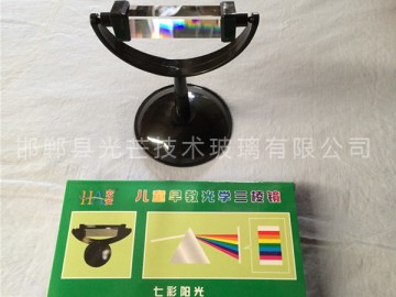 三棱鏡是光學棱鏡中的一種形式,在外觀上呈現(xiàn)幾何的三角形,是光學棱鏡中最常見,也是一般人所熟知的,但并不是最常用到的棱鏡。三棱鏡最常用于光線的色散,這是將光線分解成為不同的光譜成分。利用不同波長的光線因為折射率不同,在折射時會偏轉(zhuǎn)不同的角度,便會造成色散的現(xiàn)象。這種效應也被用來對棱鏡物質(zhì)進行高精密度的折射系數(shù)測量。 物質(zhì)的折射系數(shù)固然在不同的波長會有所不同,但有些物質(zhì)的折射系數(shù)對波長的變化比其他物質(zhì)強烈(色散非常明顯)。通常,BK7玻璃的色散較低,LaSF11玻璃的色散就很明顯,因此更適宜做為色散用的棱鏡。 棱鏡的頂角(在上圖中,上面的角)能夠影響到棱鏡色散時的特性。通常,要適當?shù)倪x擇光線射入的角度和射出的角度,當角度接近布儒斯特角(Brewster angle)時,在折射時造成的損耗最小。 一束白光會分出不同顏色,一般就分為七種顏色,即紅、橙、黃、綠、藍、靛和紫。它是由透明材料作成的截面呈三角形的光學儀器,也叫“棱鏡”光學上用橫截面為三角形的透明體叫做三棱鏡,光密媒質(zhì)的棱鏡放在光疏媒質(zhì)中(通常在空氣中),入射到棱鏡側(cè)面的光線經(jīng)棱鏡折射后向棱鏡底面偏折。光從棱鏡的一個側(cè)面射入,從另一個側(cè)面射出,出射光線將向底面(第三個側(cè)面)偏折,偏折角的大小與棱鏡的折射率,棱鏡的頂角和入射角有關.白光是由各種單色光組成的復色光;同一種介質(zhì)對不同色光的折射率不同;不同色光在同一介質(zhì)中傳播的速度不同.所以,因為同一種介質(zhì)對各種單色光的折射率不同,所以通過三棱鏡時,各單色光的偏折角不同。因此,白色光通過三棱鏡會將各單色光分開,形成紅.橙.黃.綠.藍.靛.紫七種色光即色散。 1666年,英國物理學家牛頓做了一次非常著名的實驗,他用三棱鏡將太陽白光分解為紅、橙、黃、綠、藍、靛、紫的七色色帶。據(jù)牛頓推論:太陽的白光是由七色光混合而成,白光通過三棱鏡的分解叫做色散,彩虹就是許多小水滴為太陽白光的色散. 白光是由各種單色光組成的復色光;同一種介質(zhì)對不同色光的折射率不同;不同色光在同一介質(zhì)中傳播的速度不同 。因為同一種介質(zhì)對各種單色光的折射率不同,所以通過三棱鏡時,各單色光的偏折角不同。因此,白色光通過三棱鏡會將各單色光分開,即色散。
